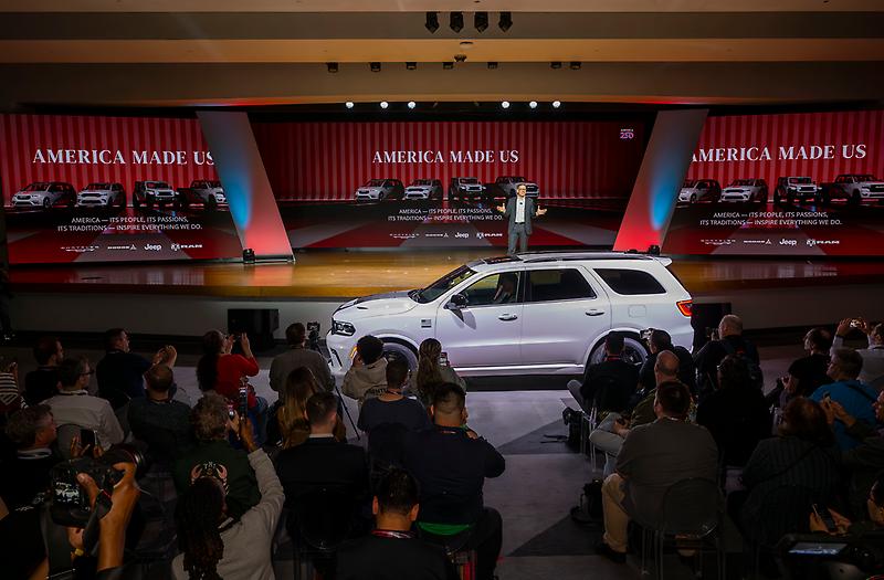 Matt McAlear, Dodge CEO, reveals the 2026 Dodge Durango America250 edition at the 2026 New York International Auto Show media preview on Apr…