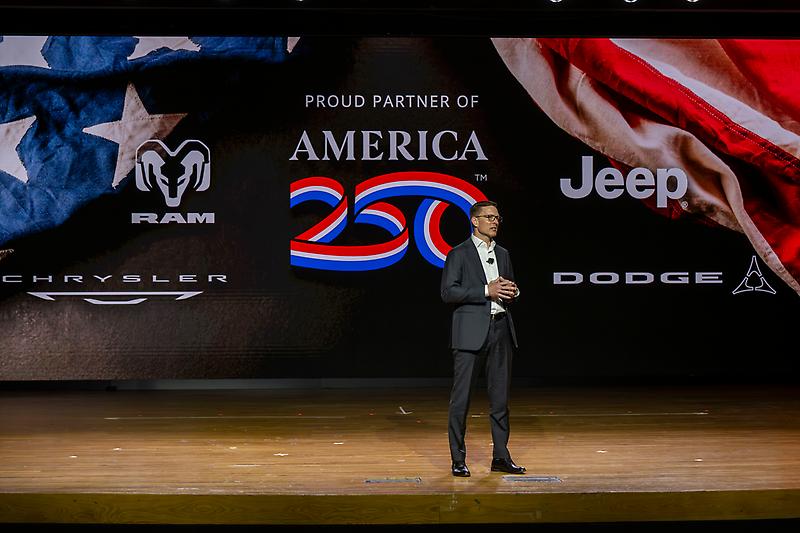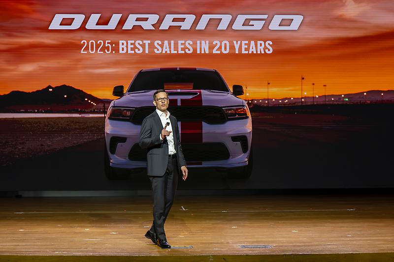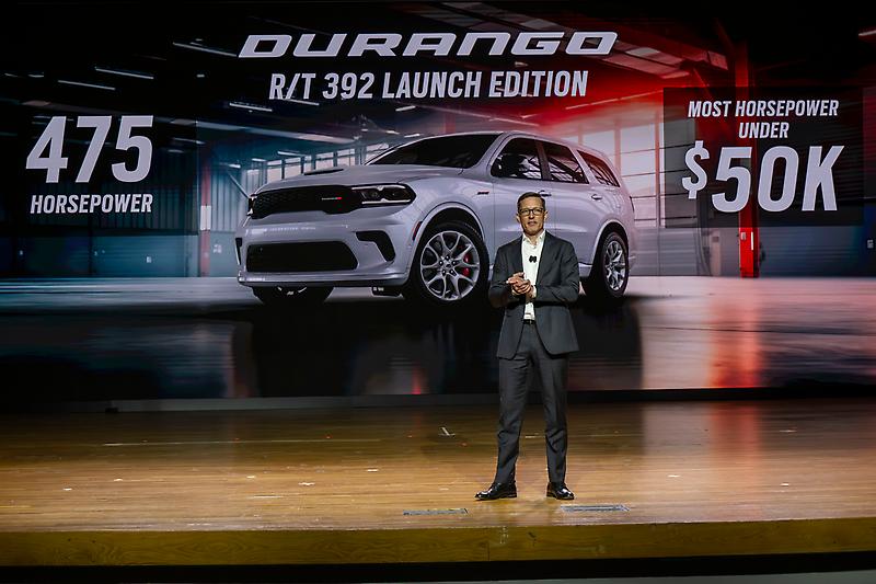 Matt McAlear, Dodge CEO, on stage during the reveal of the 2026 Dodge Durango America250 edition at the 2026 New York International Auto Sho…