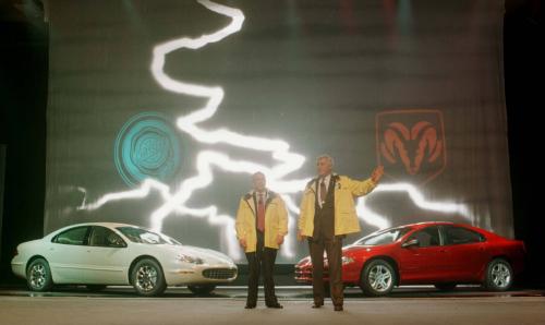 Chrysler Vice Chairman Robert Lutz (R) checks for more lightning with Chrysler Chairman Robert Eaton during their "Lightning Strikes Tw…