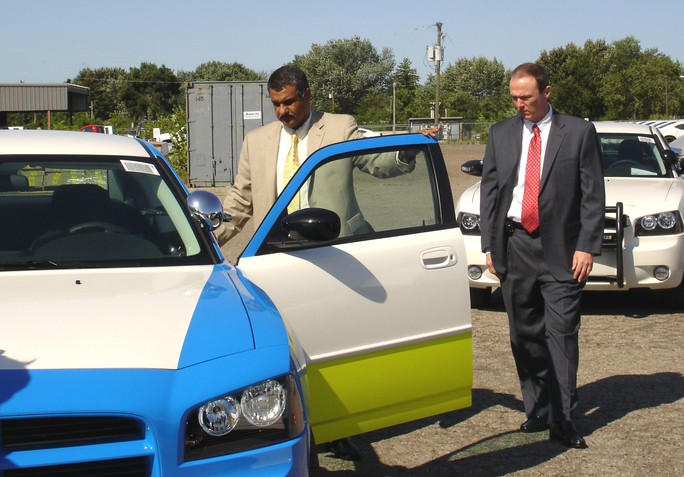 Kuwait’s Deputy Ministry of Interior, Musaed S. Al-Guwainem, checks out the Dodge Charger traffic enforcement pilot vehicle with Trent Barcr…