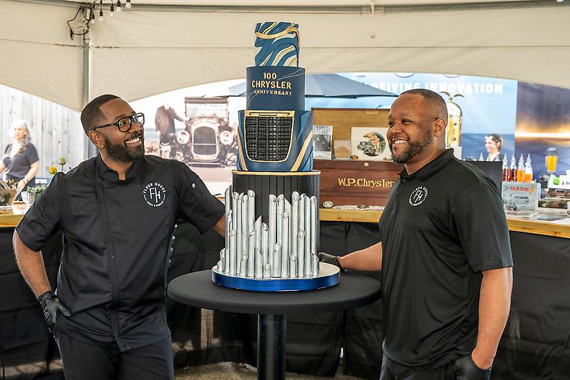 Chef Lincoln Alexander (left) of Flour House Cakes and team member Maurice Mitchell bring out a custom birthday cake honoring Chrysler brand…