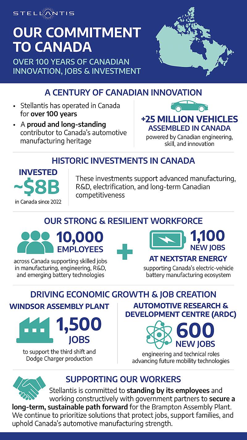Download Print Stellantis Expands Canadian Workforce as Windsor Assembly Plant Surpasses 1,000 New Hires for Third Shift Third shift added at Windsor Assembly Plant to meet anticipated demand for new SIXPACK-powered Dodge Charger Scat Pack, Charger Daytona and Chrysler minivan family – America’s best-selling minivan and the No. 1 best-selling minivans in Canada To date, nearly 240 Brampton Assembly Plant employees have elected to transfer to Windsor while all other hourly workers impacted by the operational pause continue to receive 70% of their salary, as well as health benefits Hiring milestone builds on Stellantis' broader Canadian growth, including 600 new engineering jobs at the Automotive Research and Development Centre and 1,100 jobs at NextStar Energy since 2023 Since 2022, Stellantis has invested $7.9 billion in Canada on projects that are either complete or near completion December 15, 2025 , Windsor, Ontario - Stellantis today announces it has reached a major hiring milestone at its Windsor Assembly Plant. With more than 1,000 employees now on board, this achievement marks a significant step toward the creation of 1,500 jobs for the third shift launching at the plant in early 2026, reinforcing Stellantis’s long-term investment in its Canadian operations. Since 2022, Stellantis has spent $7.9 billion in Canada, underscoring its commitment to strengthening the country’s automotive manufacturing sector and to supporting economic growth in the communities it serves. Stellantis currently employs approximately 10,000 Canadians across its manufacturing plants, research and development centre, and business and distribution operations nationwide. “Today’s announcement reinforces Canada’s critical role in Stellantis’ global operations,” said Trevor Longley, president and CEO of Stellantis Canada. “For more than a century, we’ve proudly assembled vehicles here - more than 25 million to date. With major investments and a growing workforce, we remain confident in Canada’s talent, innovation and manufacturing strength. As we lead the future of advanced automotive production, we’re thrilled to see our new Windsor Assembly Plant team hit the ground running.” Windsor Assembly Plant has been the production home of the company’s award-winning minivan family for 42 years, first launching in 1983. It currently assembles the Chrysler Pacifica, Chrysler Voyager and Grand Caravan minivan, the No. 1 best-selling minivan in both Canada and the U.S. Earlier this month, Windsor Assembly Plant celebrated the official production launch of the all-new, SIXPACK-powered, two-door 2026 Dodge Charger Scat Pack. Alongside the Charger Scat Pack, Windsor is producing two- and four-door versions of the all-electric, 670-horsepower, 2026 Dodge Charger Daytona Scat Pack, the world’s quickest and most powerful muscle car. Production of the SIXPACK-powered Dodge Charger R/T and four-door SIXPACK-powered Charger models will begin in the first quarter of 2026, expanding the brand’s offerings and giving customers the freedom to choose the multi-energy powertrain best suited to their needs. Supporting Impacted Workers in Brampton Stellantis continues to work constructively with government partners, labour organizations and relevant stakeholders to strengthen Canadian operations and to create long-term employment opportunities. A key priority is supporting impacted employees at the Brampton Assembly Plant. To date, nearly 240 employees have accepted transfer opportunities to Windsor Assembly Plant to take on new roles. All other hourly workers impacted by the operational pause will continue to receive 70% of their salary, as well as health benefits. A Century of Canadian Automotive Innovation For more than 100 years, Stellantis has helped shape Canada’s automotive industry. That legacy continues to inform the company’s work today and reinforces its commitment as it looks ahead to the next chapter of Canadian innovation, manufacturing and economic growth. With major investments underway, Stellantis is building on its century-long presence to deliver the next generation of dependable vehicles and strengthen Canada’s position in the global automotive sector. Stellantis North America Stellantis (NYSE: STLA) is a leading global automaker, dedicated to giving its customers the freedom to choose the way they move, embracing the latest technologies and creating value for all its stakeholders. Its unique portfolio of iconic and innovative brands includes Chrysler, Dodge//SRT, Jeep®, Ram, Alfa Romeo, FIAT and Maserati. In 2025, the company celebrates 100 years of influencing culture and contributing to the history of the automotive industry in the U.S. and Canada. For more information, visit www.stellantis.com. Follow company news and video on: Company blog: http://blog.stellantisnorthamerica.com Media website: http://media.stellantisnorthamerica.com LinkedIn: https://www.linkedin.com/company/Stellantis Facebook: https://www.facebook.com/StellantisNA Instagram: https://www.instagram.com/stellantisna X: @StellantisNA YouTube: http://youtube.com/StellantisNA Windsor Assembly Plant