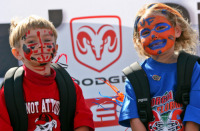Download Print Gator Fans Win Mega Mug Shot and Mega Spirit Contests at Florida vs. Georgia Football Game University of Florida and University of Georgia Fans Demonstrate Their Mega Team Spirit While Benefiting Hurricane Relief Efforts Winners receive Dodge Mega Livin' Spirit Packages containing University of Florida gear Chrysler Group will donate $10,000 to American Red Cross on behalf of each "Dodge Mega Livin', Mega Givin'" contest participant October 30, 2005 , Jacksonville, Fla. - Florida Gators fans proved victorious in the "Dodge Mega Livin', Mega Givin'" face painting and team cheer contests outside Jacksonville's Alltel Stadium Saturday, Oct. 29, in a contest that raised money for hurricane relief efforts. The Mega Mug Shot and Mega Spirit contests were created by Dodge to engage University of Florida and University of Georgia fans in a larger than life celebration of everything big, including one of the biggest college football rivalries and tailgating parties in the country, and the all-new 2006 Dodge Ram Mega Cab truck with the largest pickup cab ever. Five-year-old Brooke Toy, from Callahan, Fla., won the Mega Mug Shot competition with her interpretation of what a true Gators fan should look like. Young relatives of Florida Gators wide receiver Chad Jackson, spanning in ages from 6 through 12 from Jacksonville, Fla., tied with Taylor Beasley, 10, also of Jacksonville, to win the Mega Spirit competition by impressing the judges with a colorful and original cheers that not only exhibited their vocal creativity, but acrobatic skills as well. The winners of both contests won a Dodge Mega Livin' Spirit Package filled with University of Florida gear. "If Brooke thinks she has a chance to win something, she'll do anything," said Brooke’s father, Josh Toy, of Callahan, Fla. “This contest was a great way for her to show Gators team spirit.” Chrysler Group will donate $10,000 on behalf of participants — who competed in all three Dodge Mega Livin', Mega Givin' challenges held Oct. 27–Oct. 29 — to the American Red Cross to benefit hurricane relief efforts. "The Florida-Georgia game is a natural fit for the Dodge brand's 'mega-sized' celebration — recognizing the biggest fans at one of the biggest rivalries in college football," said Fred Diaz, Director – Dodge Marketing Communications, Chrysler Group. "It's a wonderful opportunity to expose these 'mega fans' to the all-new Dodge Ram Mega Cab, a truck that itself understands the 'go big or go home' philosophy." 2006 Dodge Ram Mega Cab Dodge introduces the largest pickup cab ever. The all-new 2006 Dodge Ram Mega Cab features an innovative interior that takes comfort and convenience to a new level in the full-size pickup segment. Its larger-than-life interior space offers seating for six adults, with plenty of head, shoulder, leg and hip room, and the most interior cargo storage and seating configurations available in the full-size pickup truck market. The all-new 2006 Dodge Ram Mega Cab further solidifies the Dodge Ram truck lineup's long list of leadership claims: fastest, strongest, most powerful, most capable — and now, most spacious and versatile.